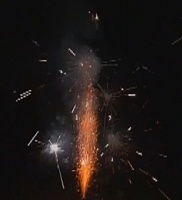 Вначале из верхней части пиротехнической батареи вырывается мощный поток огненно-золотых искр, переходящий в трескучие разрывы золотыми же бенгальскими искрами, вперемешку с красными светлячками;